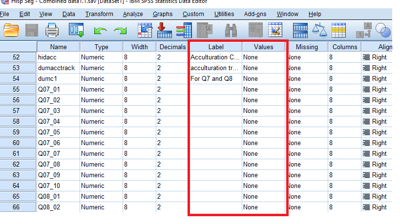 SPSS Variable and Value Labels: A Quick Tutorial - Alchemer Mar 17, 2016 · The above two examples works fine however, if we really want to trim down our code, we can use one more short-cut by only using the Value Label command once and then applying the labels to each variable. VALUE LABELS / var503 TO var504 0 ‘Unchecked’ 1 ‘Checked’ / var603 TO var605 1 “Couldn’t care less” 2 ‘Somewhat devoted’ 3 “Can’t live w/o it!”